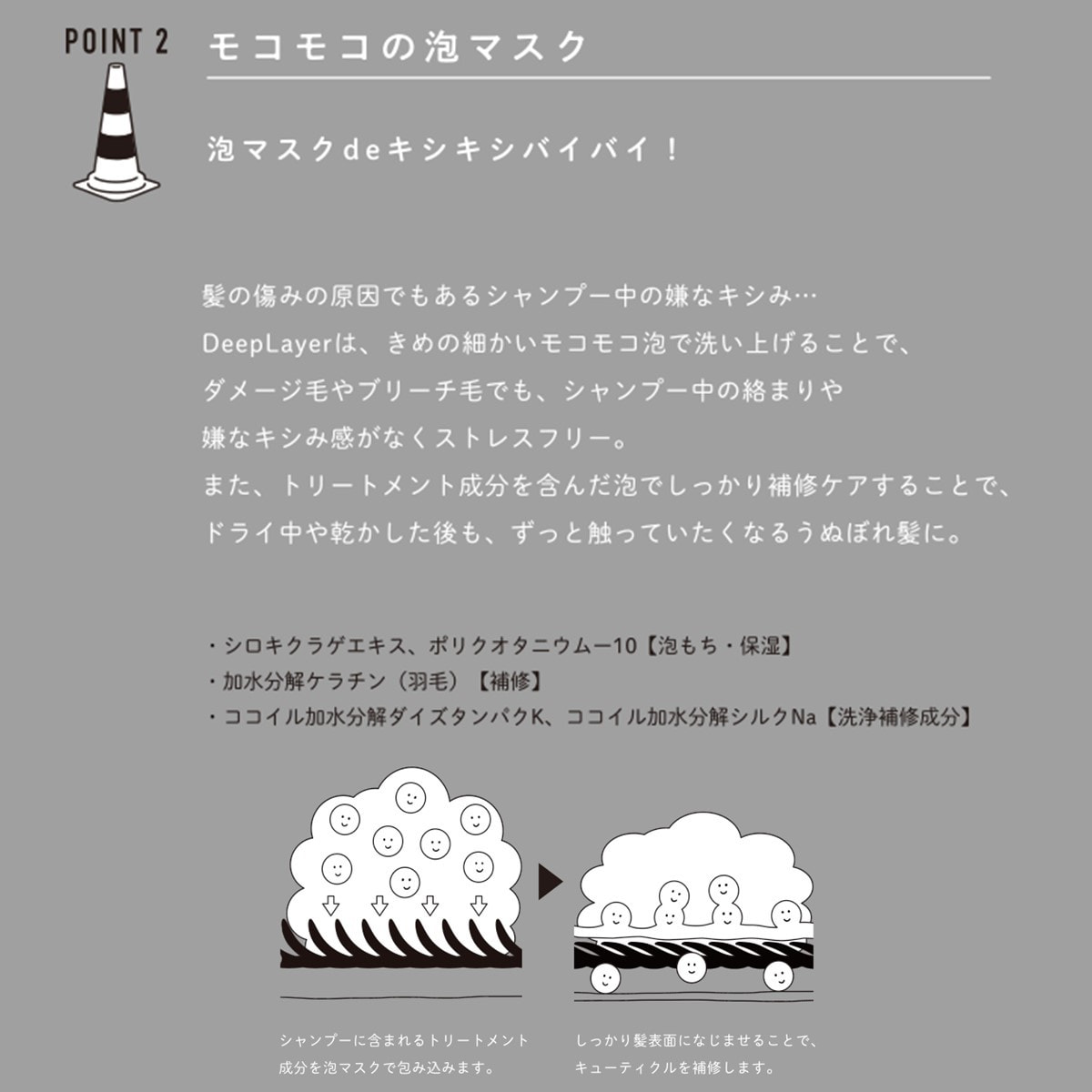 浸透成分が、補修成分や保湿成分を抱き込みながら毛髪内部まで届けます。